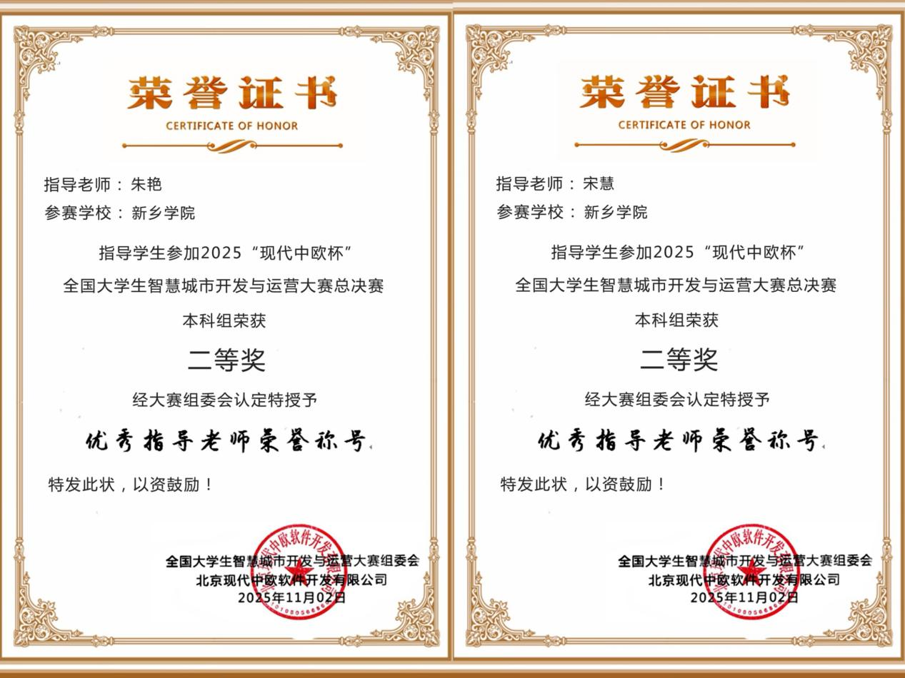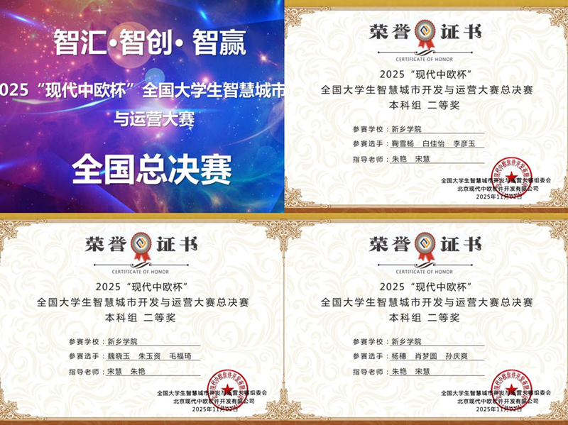 2025年11月1日,2025“现代中欧杯”全国大学生智慧城市开发与运营大赛总决赛在云端圆满落幕。总决赛通过腾讯会议云端举办,共有来自全国58所院校的165支队伍、千余名学子同台竞技。新乡学院管理学院23级物业管理专业共3支参赛队伍进入全国总决赛,凭借扎实的专业功底与出色的实践能力,斩获全国二等奖。指导教师朱艳、宋慧获评“优秀指导老师”称号。