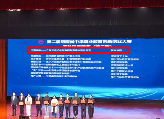 由陈思梵、董家蕊、高钰迅、李甜甜、李凯玥、邹冰艳、张宇涵等7名学子组成的“书页戏韵——立体互动式老年豫剧有声读本设计开发”团队,在指导老师王孟琪的指导下,用务实创新的管理理念凸显项目价值,路演中热情饱满、答辩时从容精准,最终斩获佳绩,获得省级三等奖。