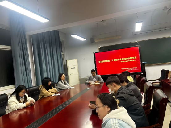 党支部书记朱修平老师首先作专题导学,围绕四中全会召开的背景、重大意义、主要成果和核心内容进行了系统梳理和深入解读。并结合当前国际国内形势以及青年大学生的时代责任,强调了学习宣传贯彻全会精神的重要性。他希望全体学生党员要提高政治站位,先学一步、学深一层,做到学思用贯通、知信行统一。